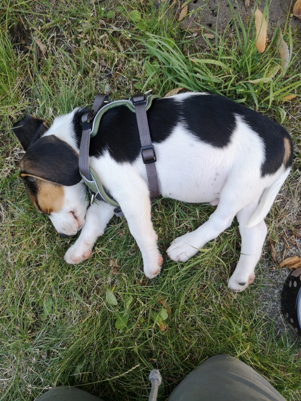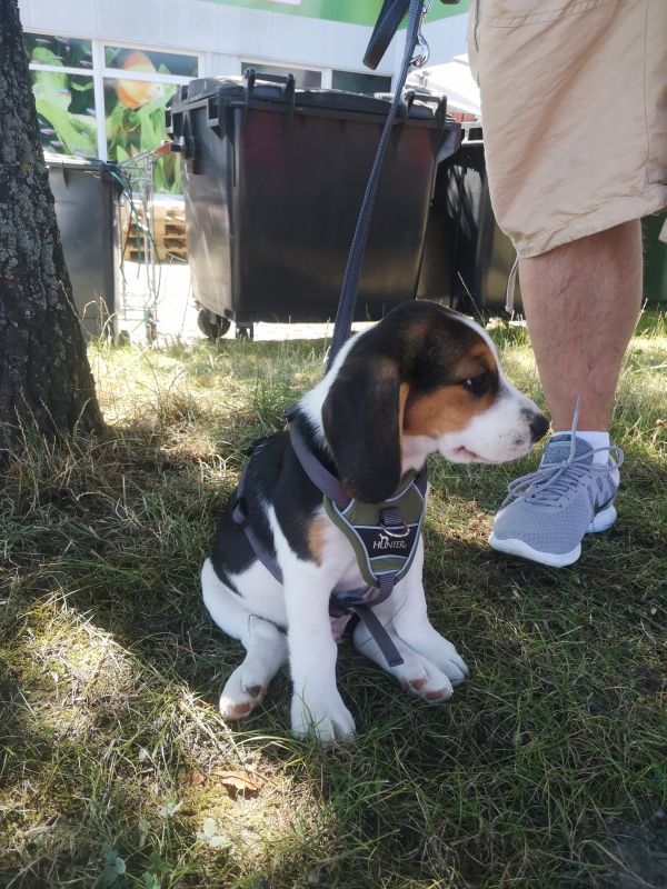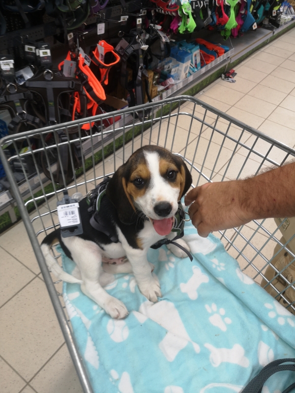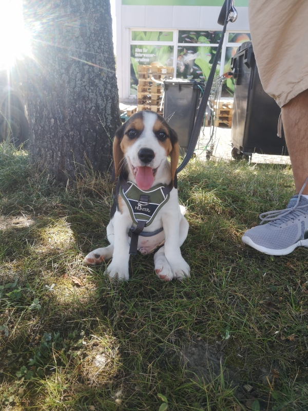 Wir waren froh als wir im Tierbedarf ankamen und ihn auf die Wiese setzten, in der Annahme er muss dringend Pippi. Natürlich nicht! Im Laden hat er erst einmal viel Wasser getrunken und er war lieb im Einkaufswagen und hat sich das Geschirr, welches wir vorab bereits ins Auge gefasst haben, brav anziehen lassen. Er hat die Größe S und die ist noch etwas reichlich:-)