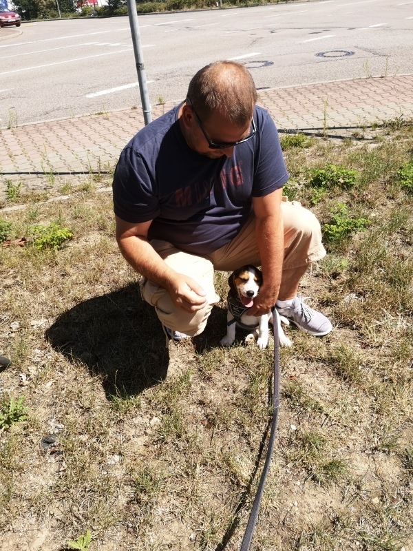 anschließend waren wir wieder auf der Wiese vor dem Laden, er tapst uns hinterher und will ins Auto springen (Haha, er kann noch nicht mal an die Trittbretter heran). Aber auch hier kein Pippi.!