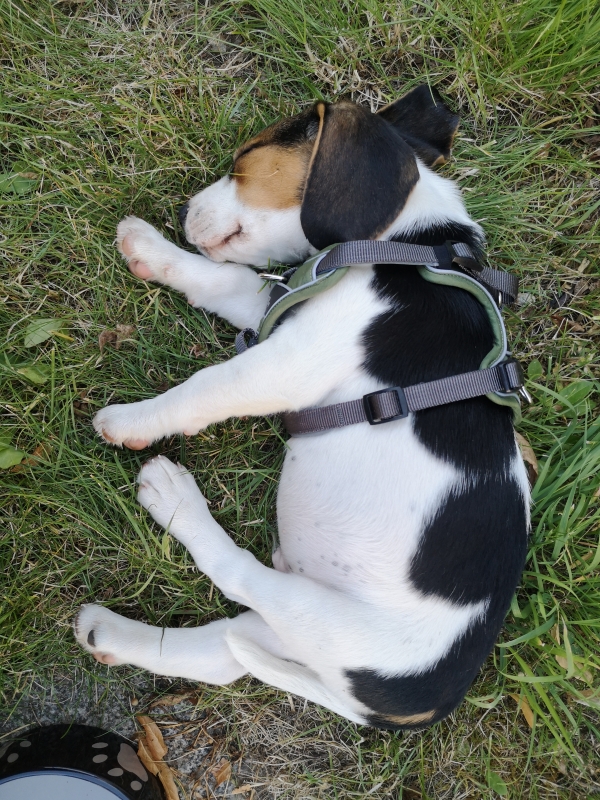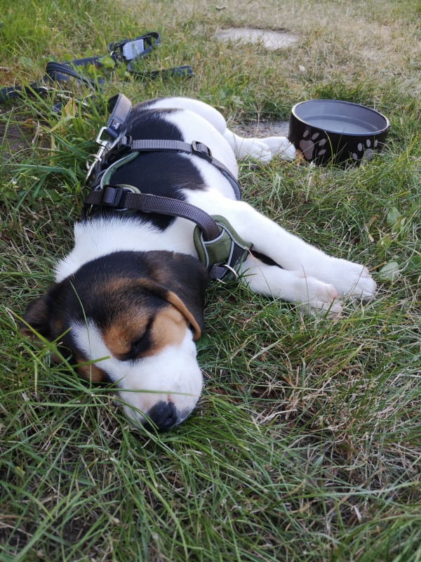 Zu Hause auf dem Parkplatz hat Kai ihm sogleich Wasser bereitgestellt und wir haben ihm auf der Wiese schnüffeln lassen. Auch jetzt immer noch kein Pippi, dann hat er viel ganz viel getrunken und dann, zack, er legt sich auf die Seite und schläft, ca. 25 min! Wir machen ihn mit der Leine am Magnolien Bäumchen fest, gehen ins Haus und machen das Fenster direkt in meinem Büro auf, von hier können wir ihn hören und sehen. Nun ja, was tun, wenn Paul schläft?