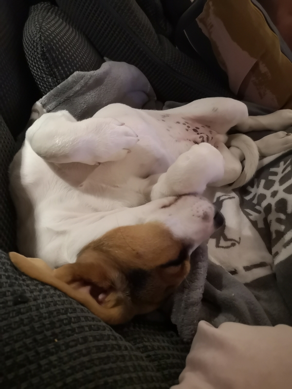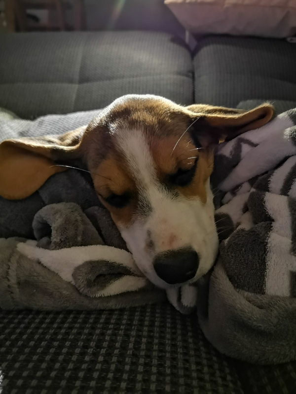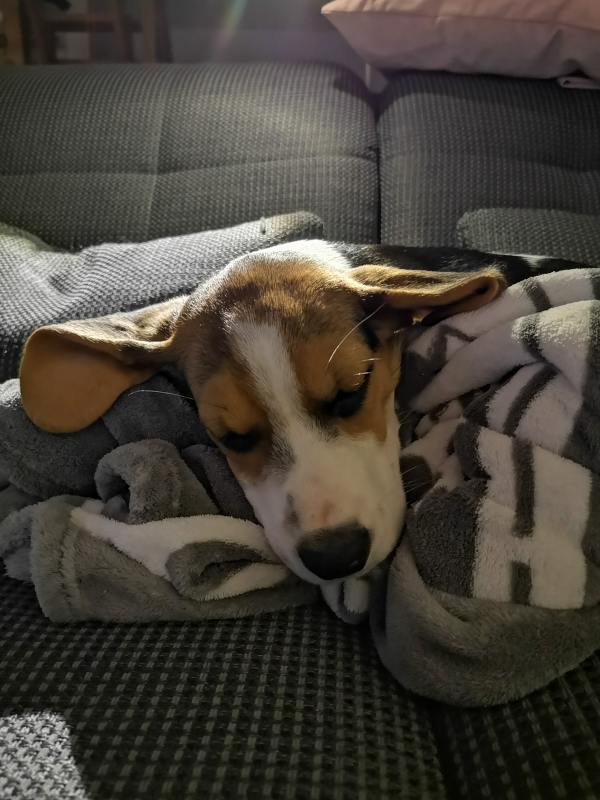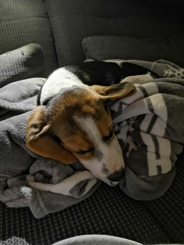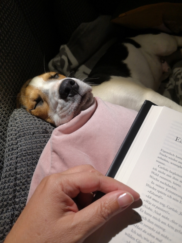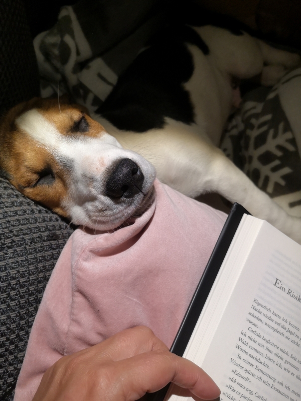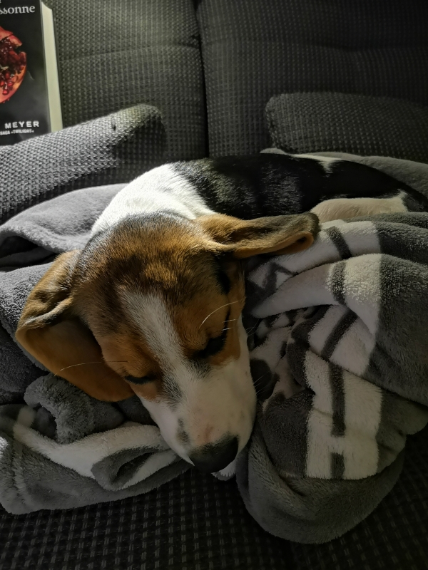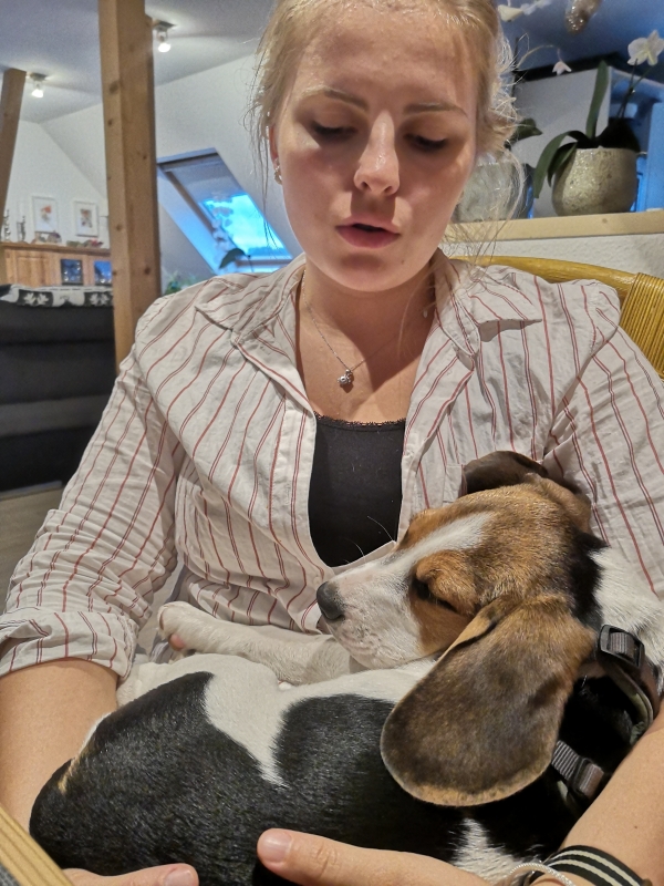 Später beim Kaffee auf der Couch bin ich auch noch im Ruhemodus auf Johannas Schoß. Ich gewöhne mich mit jeder Stunde mehr an die Stimmen und die Interaktionen dieser lieben Menschen.