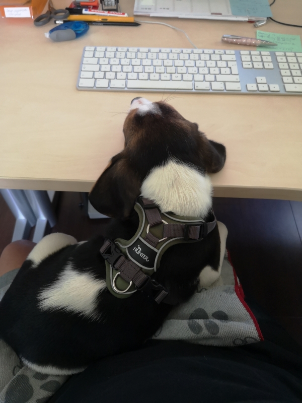 Im Büro bin ich natürlich die volle Arbeitszeit mit dabei. Bei Frauchen und Herrchen im Büro ist alles entspannt, manchmal möchte ich mich zu Susi auf den Schoss setzen und dann schaue ich, ob alles richtig gemacht wird. Immer wenn ich geschlafen oder gespielt habe, geht sie oder Kai mit mir raus. Telefon klingeln ist auch in Ordnung, ich fühl mich wohl hier.