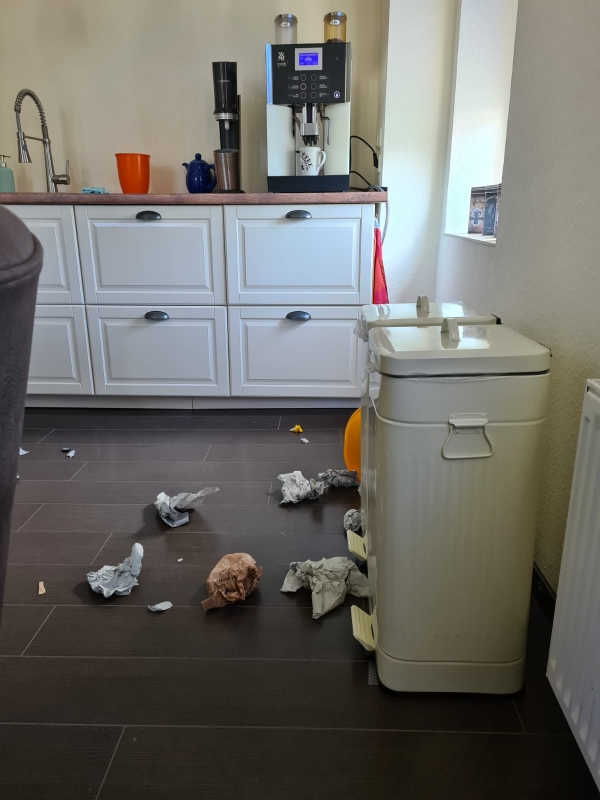 Ich habe mich in die Firmenküche geschlichen, meine Hundeeltern dachten, ich bin jeweils beim anderen :-) Sau gut habe ich das gemacht. Dann habe ich mir mal schön das Eis Papier und den Eisstiel aus dem Papiermüll geholt und habe den Inhalt des Mülleimers im Zimmer verteilt.