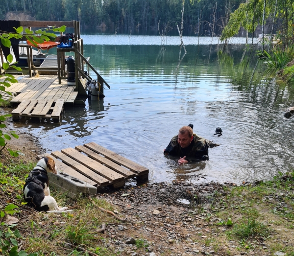 Wir waren am See am Samstag und Sonntag, ich verfolge die Taucher und höre auf die Geräusche, die das Wasser macht, wenn die Blasen blubbern. Ich schaue auch ganz genau wo Susi ist, wenn Sie an der Oberfläche Scootern und ich kontrolliere ebenfalls, dass sie nicht aus meinem Sichtfeld schwimmt, das gefällt mir nicht, es muss mindestens immer einer der beiden hier bei mir sein. Mit Argwohn betrachte ich das Abtauchen von Kai, also so ohne ihn sehen ist irgendwie nicht schön.