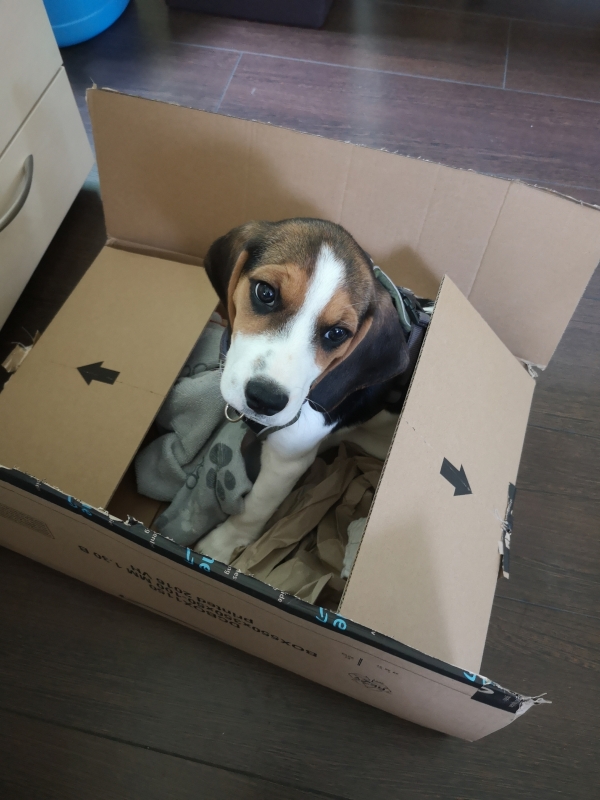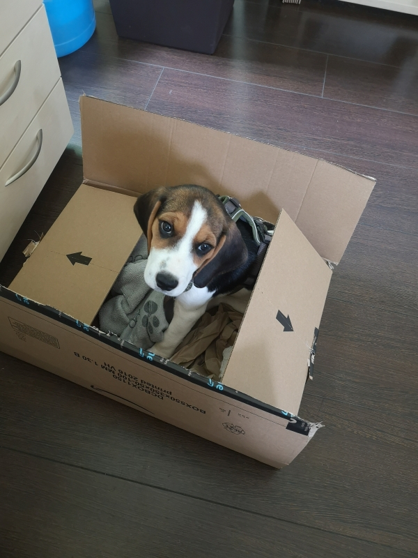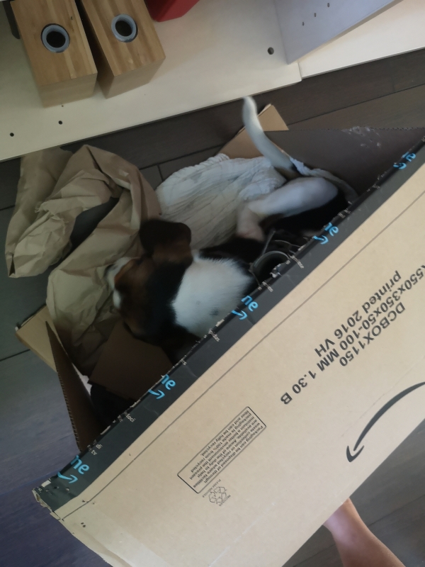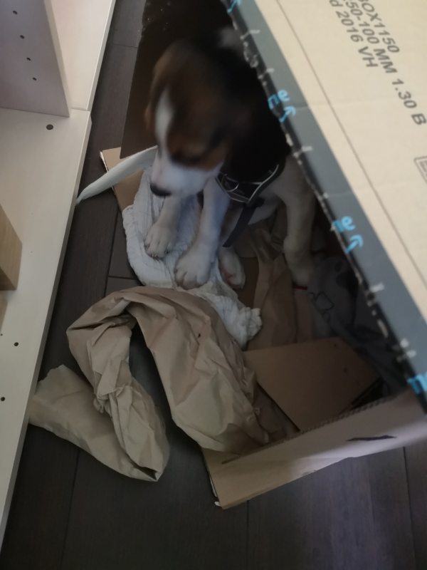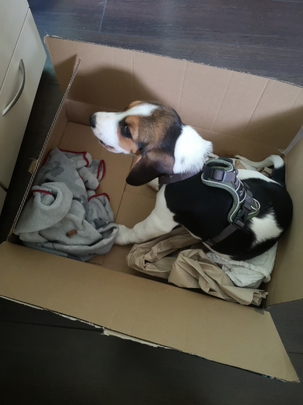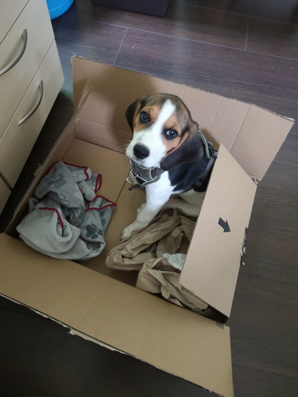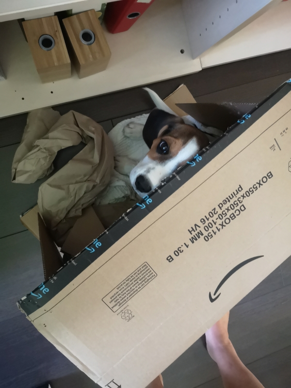 Damit ich immer etwas zu tun habe, hat Kai mir einen ausrangierten Karton ins Büro gestellt und da hat er kleine Leckerli hineingetan.